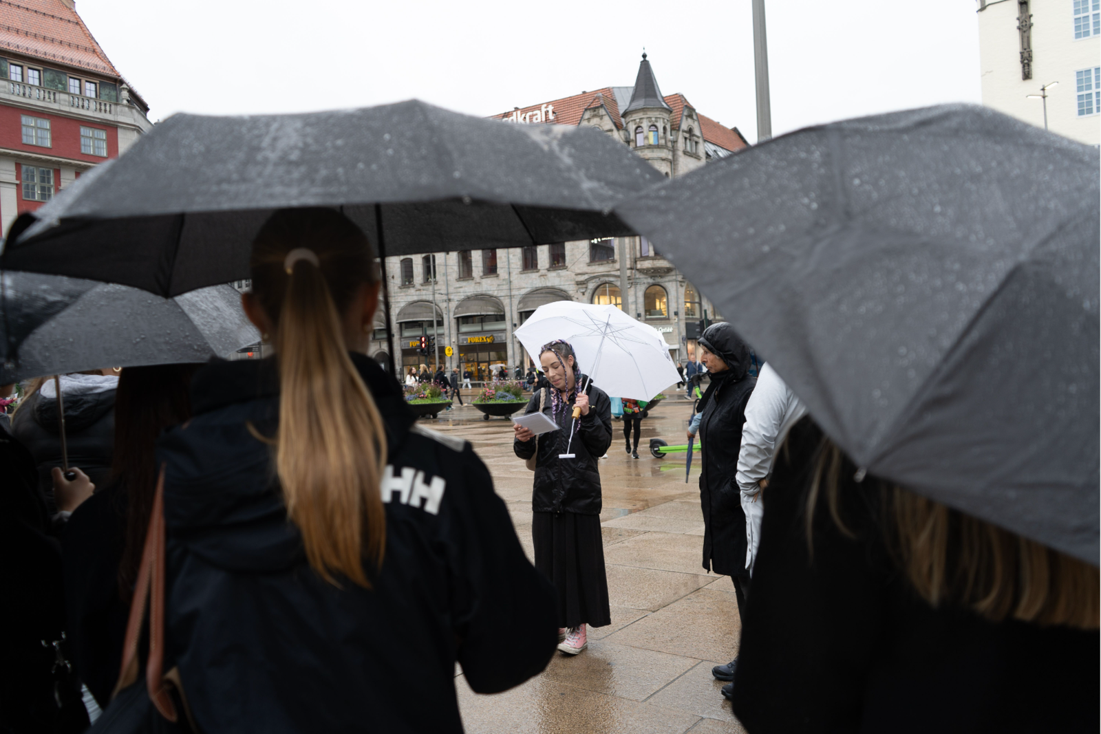 Regnet har akkurat begynt å pøse ned da en nervøs Michelle Alexandra Muren går bort til tigerskulpturen på Jernbanetorget iført rosa Converse-sko. Hun gruer seg litt i dag. Hun skal lede en byvandring for Gatestemmer og fortelle sin historie til en gruppe med videregåendeelever. Det er dette som gjør Michelle usikker.